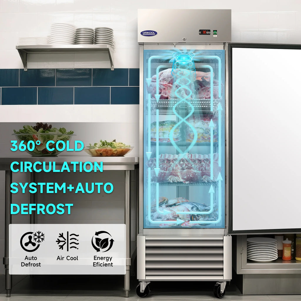 El congelador comercial vertical Orikool de 27" ofrece una amplia capacidad de 23 pies cúbicos en un ancho compacto de 27", lo que lo hace ideal para restaurantes, cafeterías y servicios de catering. Fabricado con una resistente estructura de acero inoxidable y equipado con componentes de calidad profesional, esta unidad garantiza un rendimiento de congelación constante y una fiabilidad duradera para el uso comercial diario.