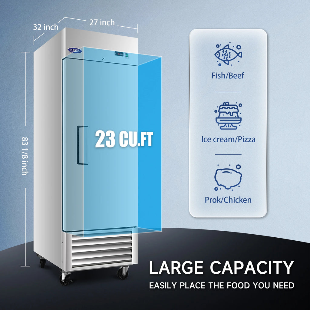The Orikool 27″ Commercial Reach-In Freezer offers a spacious 23 Cu Ft capacity within a compact 27-inch width, making it ideal for restaurants, cafés, and catering services. Built with durable stainless-steel construction and equipped with professional-grade components, this unit ensures consistent freezing performance and long-term reliability for daily commercial use.