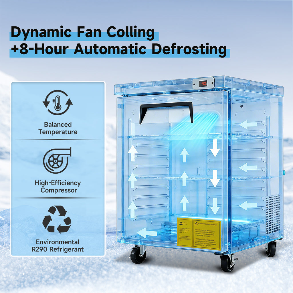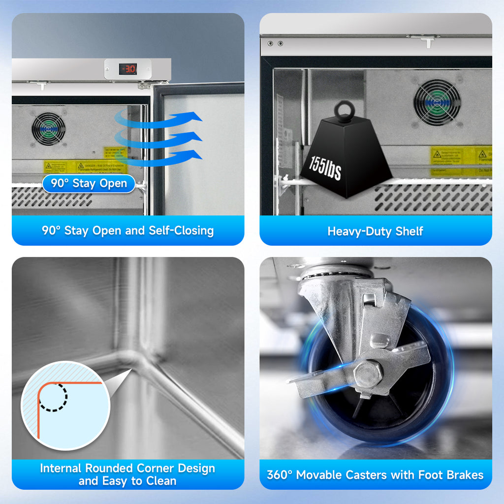 - User-Friendly Mobility & Access: Mounted on 5″ caster wheels with brakes for easy movement and stability. The self-closing door stays open beyond 90° and closes automatically below 90°, improving workflow and cold-air retention.
