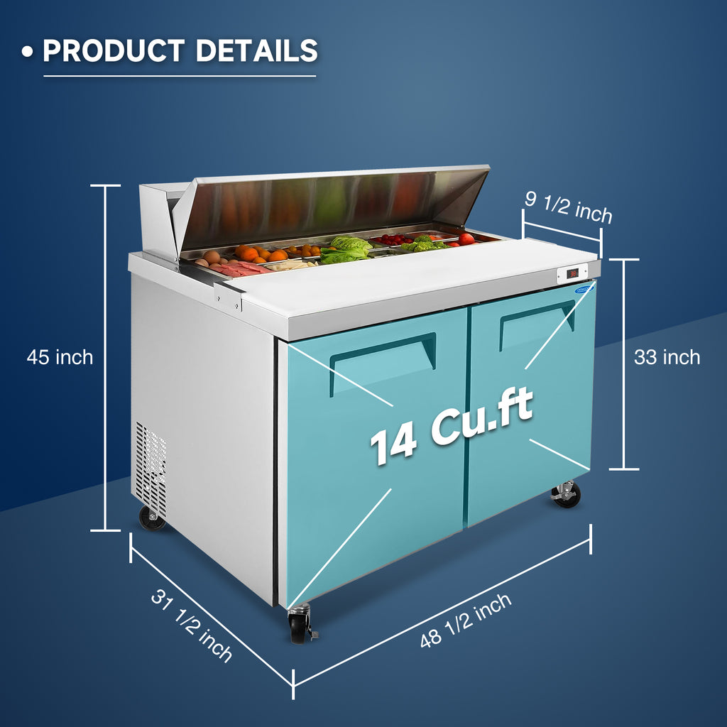The Orikool 48″ Commercial Salad & Sandwich Prep Table Refrigerator offers a robust 14 Cu Ft refrigerated compartment paired with a full-width top prep space holding 12 food pans—ideal for delis, cafés, and fast-casual kitchens requiring swift ingredient access and reliable cold storage.