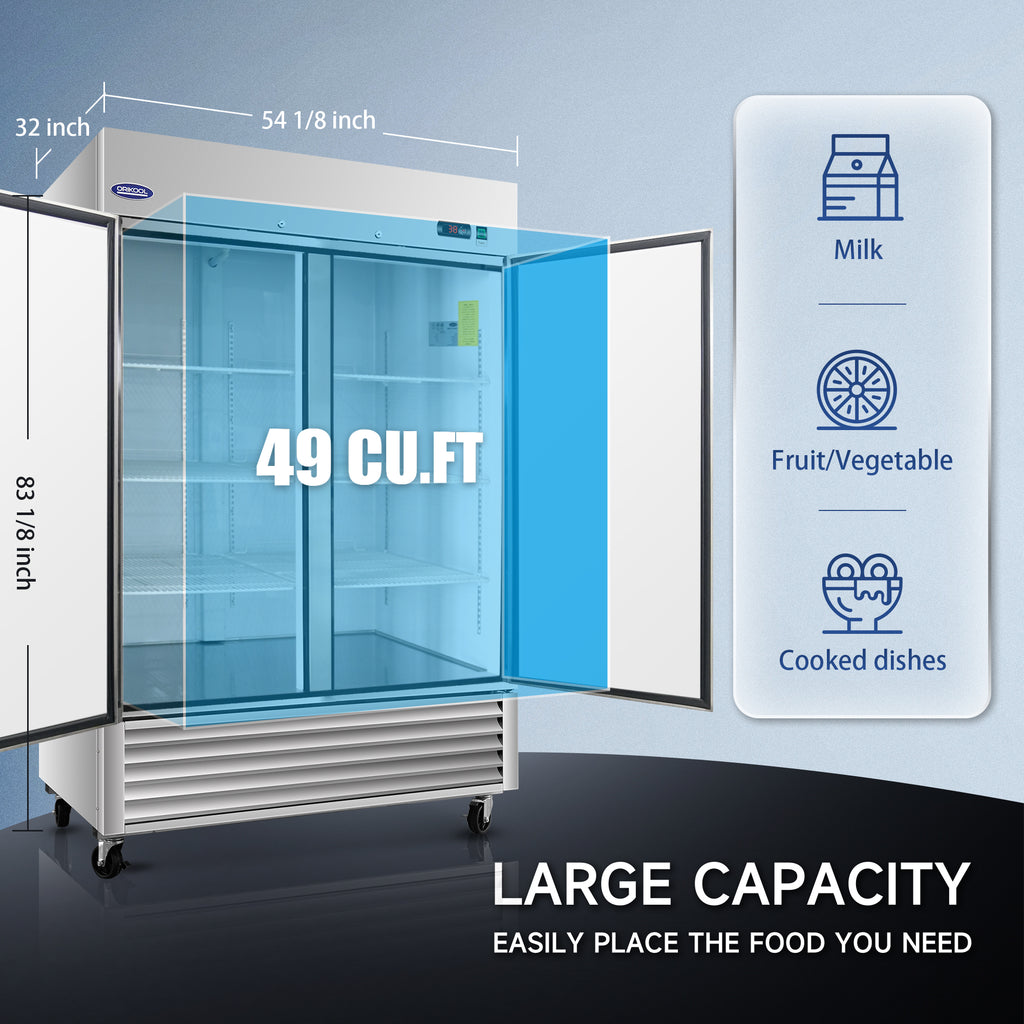 The 54″ Commercial Reach-In Refrigerator provides a generous 49 Cu Ft capacity within a space-efficient 54-inch width, ideal for restaurants, cafés, and catering operations that require dependable refrigeration. Built with durable stainless-steel construction and equipped with professional-grade components, this unit ensures consistent temperature control and long-term reliability for daily commercial use.