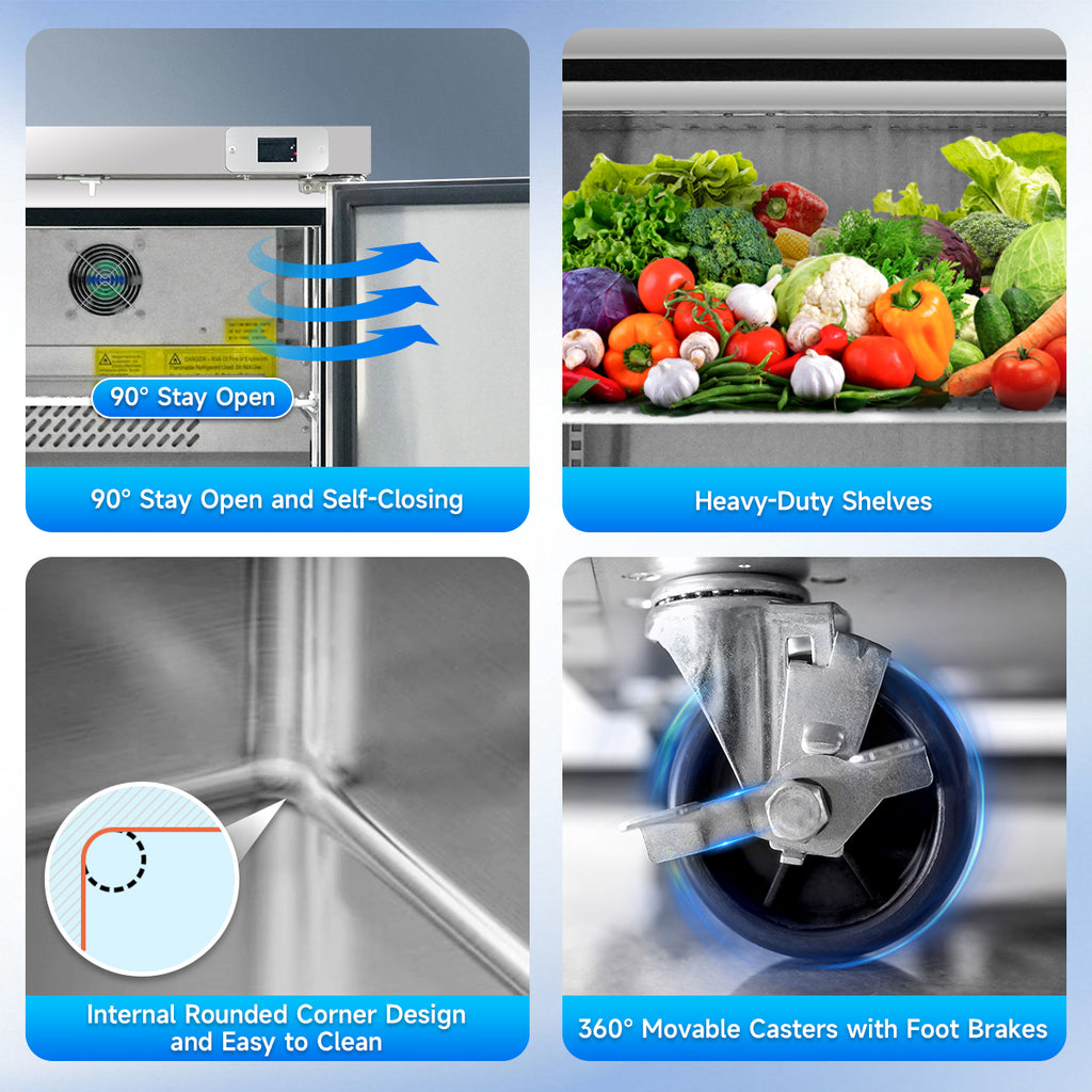 - Kitchen-Friendly Mobility & Access: Mounted on 5″ casters with brakes for easy cleaning underneath. Self-closing doors stay open past 90° for loading and close automatically below 90°, helping retain cold air during service.
